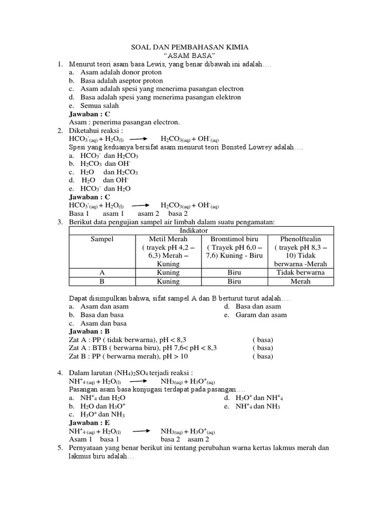 Soal Dan Jawaban Asam Basa Pilihan Ganda : Soal Pilihan Ganda Asam Basa Mudah - 40 pg dan 5 essai.